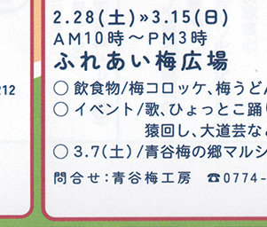 2/28(土)〜3/15(日) ・ふれあい梅広場(青谷工房)0774-39-7886